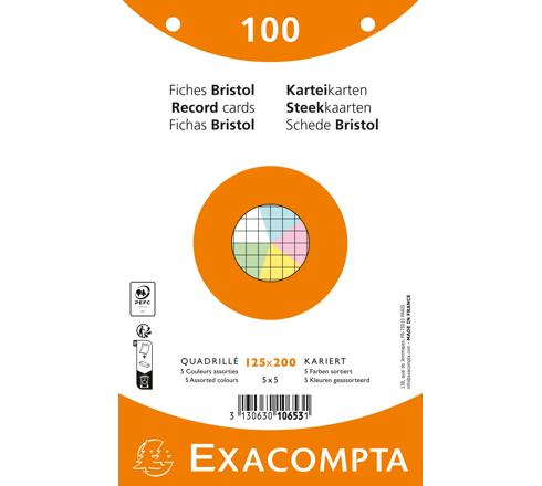 PAQUET 100 FICHES SOUS FILM - BRISTOL QUADRILLÉ 5X5 PERFORÉ - 125X200MM - COULEURS ASSORTIES
