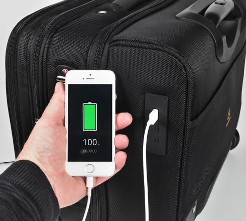 Mit ausziehbarem Teleskopgriff in einem Reißverschlussfach. Mit Schlaufe am Rücken für die Befestigung der Tasche am Teleskopgriff eines Koffers. Wird von den meisten Fluggesellschaften als Handgepäck akzeptiert.