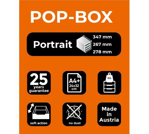 Die POP-BOX ist eine Ordnungs- und Ablagebox mit 4 geschlossenen Laden (Höhe: 55mm) für Formate in DIN A4+.