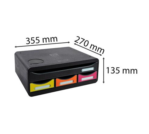Ordnungs- und Ablagebox mit 4 offenen Schubladen: 1 Schublade für Dokumente im DIN A4+ Format und 3 schmale Schubladen für kleine Bü routensilien, wie Büroklammern oder Haftnotizzettel.