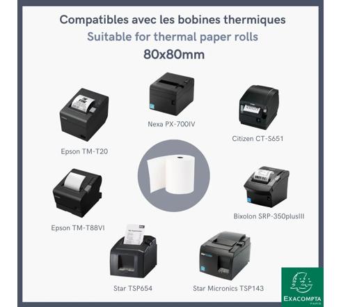 Rollenformat: 80 mm Breite und 70 mm Durchmesser. Lauflänge (+ oder - 2m): 72 m. Standard-Kern von 12 mm. Geeignet für alle Marken von Thermokassensystemen.