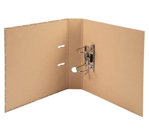 Der Ordner ist aus Recyclingkarton, mit Papier überzogen, das mit einer pflanzlichen Ölschicht beschichtet ist, durch die der Ordner wasserfest wird. Dies garantiert, dass der Ordner widerstandsfähig, langlebig und leicht zu recyceln ist, wenn man die Mechanik weglässt.