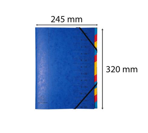 Ordnungsmappe von Exacompta mit Gummizugverschluss und bedrucktem Index. Geschützte Taben. Innenteil per Heftung zusammengefügt. Einband aus Colorspan 355 g/m2. Innen aus Recycling-Karton 170 g/m2. Kräftige Farben. Format 24,5x32 cm für DIN A4.