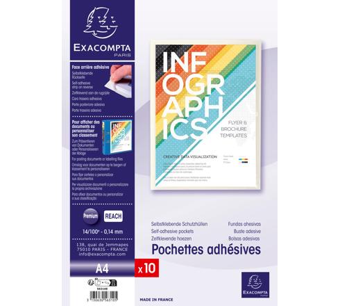SACHET DE 10 POCHETTES ADHÉSIVES PVC LISSE 14/100E - A4 - CRISTAL