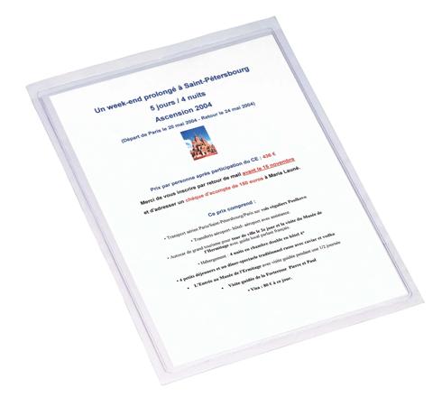 Avec une face arrière adhésive, cette pochette peut être collée sur toute surface lisse et propre et peut être utilisée pour afficher des documents ou personnaliser un classeur, une chemise, ... etc.