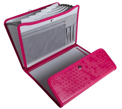 Mit 6 Fächern, die dank des Druckknopfs und Bandes sicher verschlossen bleiben.