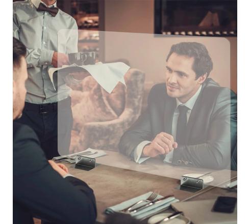 Modell zum Fixieren: Ideal für offene Räume, Großraumbüros, Call Center oder auch Restaurants. Mit Raum unter der Scheibe, um Kabel zu platzieren.