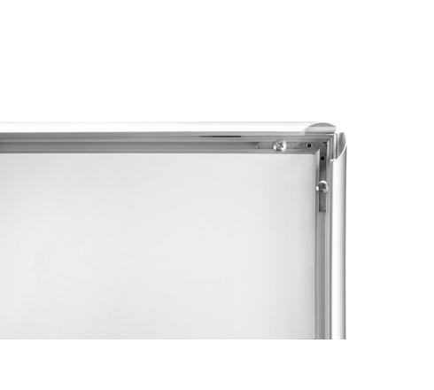 Wandplakatrahmen mit Rahmen aus Aluminium in A4 für die Wandmontage. Sowohl vertikal, als auch horizontal einsetzbar. Die Öffnung zum Aufklappen auf der Vorderseite ermöglicht ein leichtes Wechseln der Aushänge (Poster, Flyer etc.). Wird mit Hilfe des mitgelieferten Zubehörs an die Wand fixiert. Breite abgeschrägte Kante aus Aluminium, Rückwand aus PS, transparente Scheibe aus PVC, nicht spiegelnd.