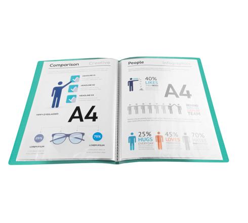 Die Sichtmappe ist mit einem Einband aus mit Pflanzenöl beschichtetem Karton ausgestattet, der einen Schutz vor Flecken und Schmutz bietet. Ein Einband aus Karton, das sind 10-60% Plastik, das eingespart wird.