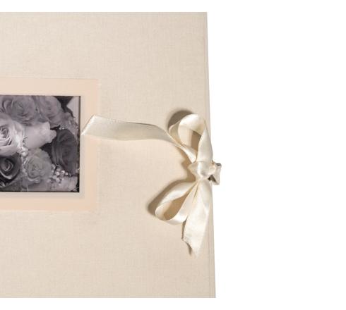 Stoffeinband mit Satinband. Fenster für die Personalisierung des Deckels. Das Fotoalbum ist ein traditionelles Album im Großformat mit Schutzblatt aus Pergaminpapier.