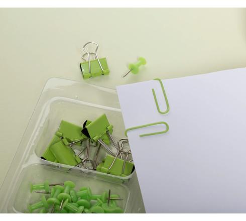 Das Set besteht aus 20 Pinnnadeln, 30 Büroklammern und 8 Foldback-Klammern aus Metall. In einem Kunststoffetui mit 3 Fächern.