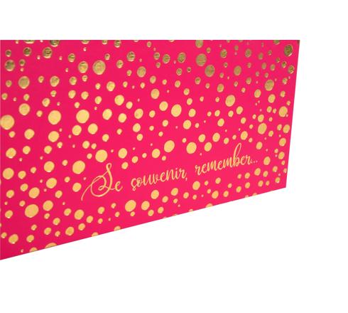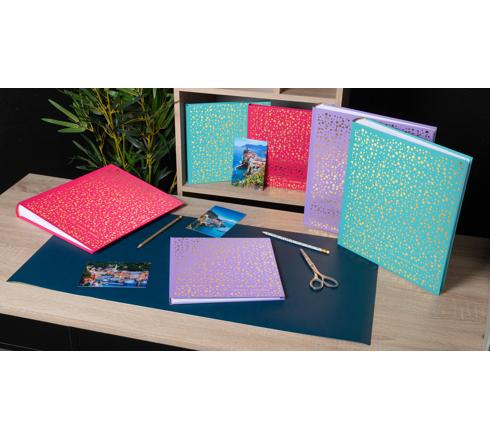 Dieses farbenfrohe Fotoalbum bietet ein außergewöhnliches Design mit goldenen Punkten, die als Relief auf dem Einband eingeprägt sind. Der Einband ist mit einem leichten Schriftzug verziert und macht das Album Plum' perfekt, um die kostbaren Momente Ihres Lebens festzuhalten.