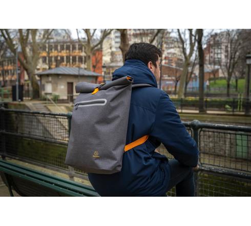 Großes Hauptfach mit separater gepolsterter Tasche für Laptop und Tablet. Rollverschluss und verstellbarer Riemen, um die Höhe des Rucksacks anzupassen.