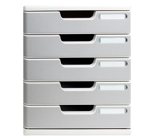Modulo ist ein elegantes und funktionales Ordnungssystem mit 5 Schubladen, in denen Dokumente im Format A4 und A4+, Sammelmappen mit Gummizug 24x32 cm und großformatige Umschläge abgelegt werden können. Es eignet sich für den Einsatz im Büro oder in der Schule.