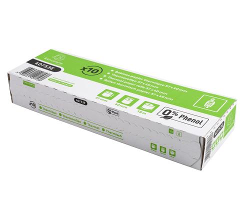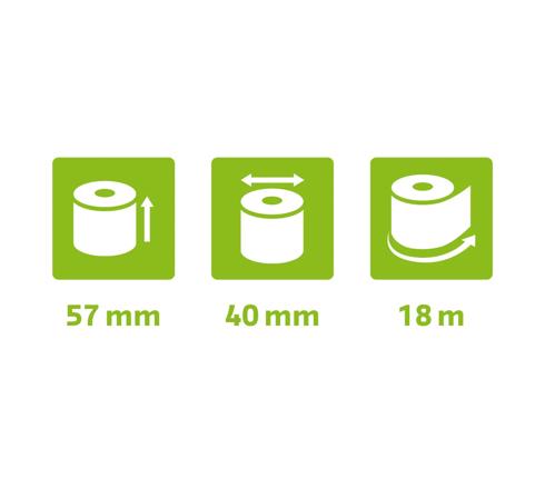 Rollenformat: 57 mm Breite und 40 mm Durchmesser. Lauflänge (+ oder - 2m): 18 m. Standard-Kern von 12 mm. Geeignet für alle Marken von thermischen Zahlungsterminals.