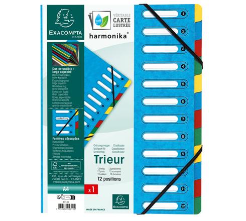 ORDNUNGSMAPPE HARMONIKA MIT AUSGESTANZTEN FENSTERN UND GUMMIZUG , AUS COLORSPAN-KARTON, MIT 12 FÄCHERN, FÜR DIN A4 - FARBEN SORTIERT