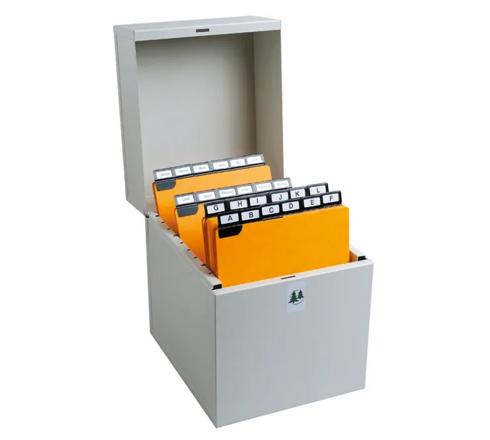 Boîte à fiches en métal, robuste et fonctionnelle.