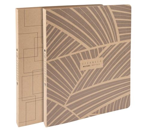 Um das schlichte, natürliche Design und den ökologischen Gedanken zu bewahren, verfügt das Ringbuch über kein aufgeklebtes Etikett, sondern ist am Rand mit einem Vordruck für die Kennzeichnung des Inhalts versehen, genauso wie mit einem Etikett.