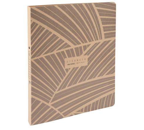 Der Einband dieses flexiblen Ringhefters ist aus einem Karton aus Neufasern und Papierresten. Der Karton ist mit einer pflanzlichen Ölschicht beschichtet, durch die der Karton wasserbeständig wird.