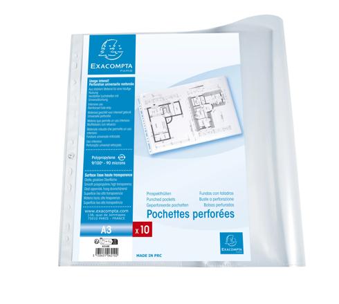 PACKUNG MIT 10 STÜCK PROSPEKTHÜLLEN, FEIN GENARBT, GELOCHT AUS STABILEM PP 1MM,DIN A3 QUER - KRISTALL