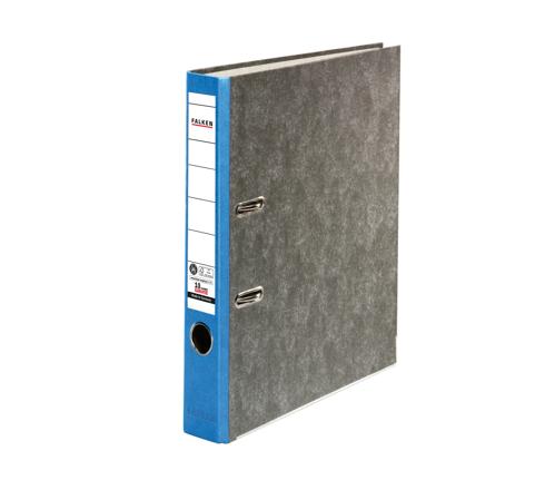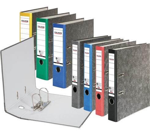 Schlitzordner im klassischen Wolkenmarmor-Design mit schwarzem oder farbigem Rücken, stabiler Pappkern, griffig genarbter Papierbezug, mit verstärkter Qualitätshebelmechanik, Kantenschutz, FSC®-zertifiziert