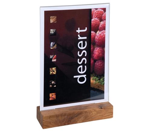 TISCHAUFSTELLER MIT HOLZSOCKEL A5 HOCHFORMAT - KRISTALL