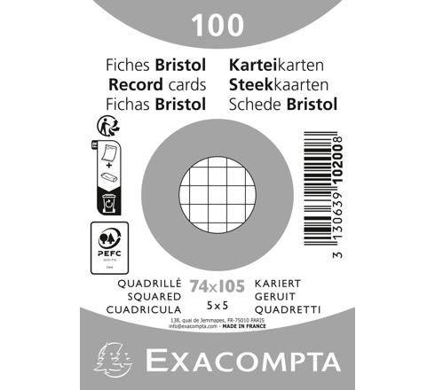 Pack of 100 record cards shrink-wrapped - squared 7.4x10cm in size. A very specific manufacturing process from fibres of selected origins. White cellulose used in neutral PH, can be used without damage to the environment - Exacompta record cards are products of very high quality with a proven and recognised reputation.