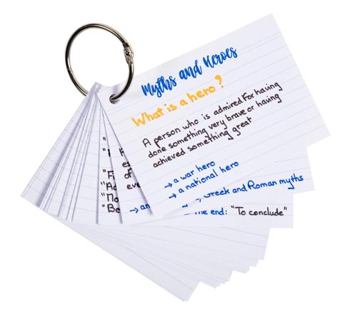 Le meilleur allié des révisions jusqu'à la dernière minute! Les flashcards sont des cartes mémoire relliées par un anneau qu'on peut enlever et remettre, très facile à manipuler. Elles permettent de regrouper des infos brèves, une information est inscrite sur le recto d'une carte, une information liée sur le verso, questions/réponses, ... pour des révisions simples et efficaces.