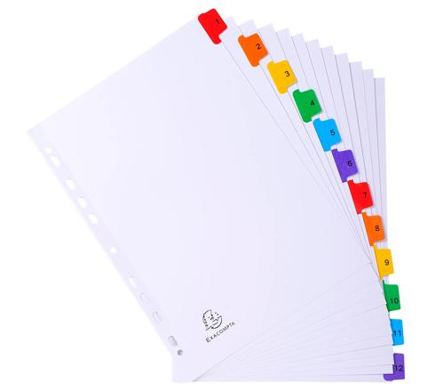 Exacompta Mylar Printed Indices, A4, 12 Part 1 to 12 The Exacompta Indices are made from 160gsm white card with coloured reinforced plastic tabs. The indices are A4 in size and are pre-printed with 1 to 12. The indices are pre punched so they can be inserted in files and folders. The indices come with a printed index page for identifying contents.
