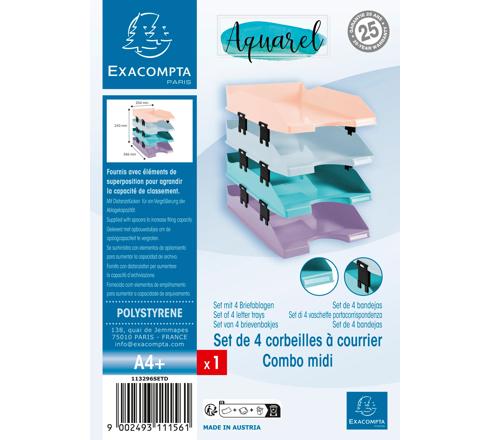 Exacompta COMBO MIDI A4 Letter Tray Set Pack of 4 letter trays for documents in A4+ format, assorted colours. 12 distance spacers included to increase the storage capacity. Robust and stable. Stackable either vertically or in steps, compatible with various letter tray models. Patented lateral COMBO 2 recesses save on space, packing and transportation costs. Storage capacity can be increased by using distance spacers.