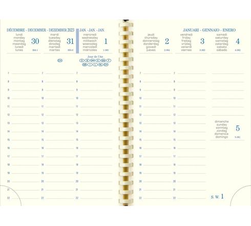 L'agenda bijou tendance ! Il se distingue par sa couverture amovible au toucher doux, son impression dorée avec un nouveau décor Poussières de Lune et sa spirale intérieure pour une ouverture à plat pratique. Profitez d'une vue hebdomadaire sur deux pages en format vertical pour une organisation optimale, avec une large plage horaire de 7h à 22h du lundi au vendredi et des espaces de notes pour le samedi et le dimanche. Édition multilingue.