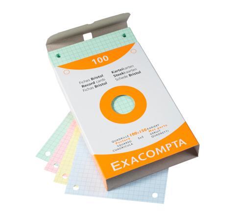 Record Cards Punched Pack 100 Assorted 100X150 Squared Exacompta Bristol record cards and made from Clairefontaine paper which is compatible for inkjet and laser printing and photocopying Each type of record card is presented in a different colour case to be easily recognisable and convenient to use Packs of index cards in a box are available individually Weight 205gsm