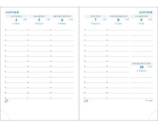 Les + : - impression en bleu et gris, sur papier blanc Clairefontaine, reconnu pour sa qualité et pour permettre une écriture douce et fluide, - tranche naturelle, - coins détachables, pour pouvoir accéder rapidement à la semaine en cours.