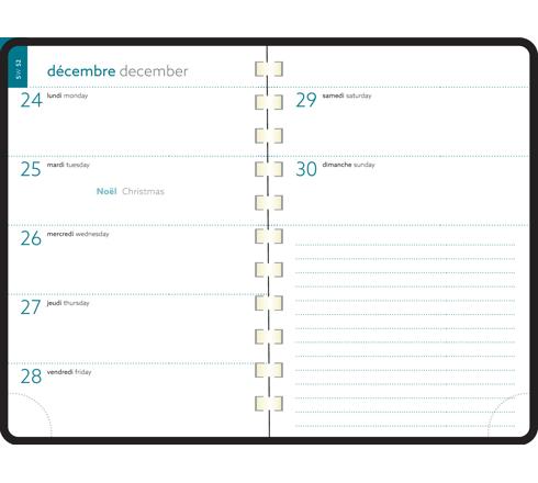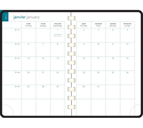 Les + : impression en bleu et vert sur papier blanc Clairefontaine, reconnu pour sa qualité et pour permettre une écriture douce et fluide - coins détachables, pour pouvoir accéder rapidement au jour en cours. Reliure spiralée pour une ouverture à plat facile.