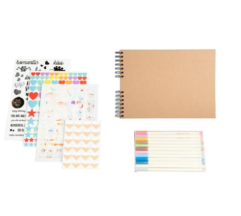 12 feutres de couleur à encre métallique sépcialement conçus pour l'écriture sur papier noir. Deux planches de stickers aux motifs c lassiques couleurs pastel et deux planches de stickers originaux et tendance couleur or, avec au total 300 stickers.