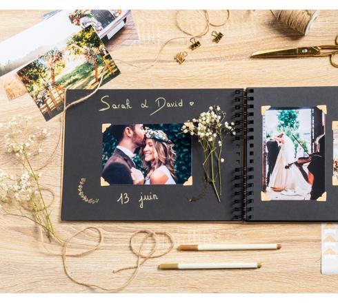 Ce kit est composé de : Album à spirales noires Kraft 32x22cm de 70 pages de papier haute qualité fabriqué en France et certifié écologique avec une capacité totale de 210 photos 10x15cm, qui garantit une excellente conservation des clichés et un très bon confort d'écriture.