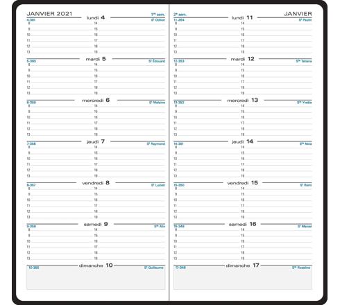 L'agenda statutaire, élégant avec son décor de surpiqûres. Unique et ultra-plat : le quinzainier ! Une semaine par page, la quinzaine en face à face. Grille horizontale, RDV sur 6 jours de 8h à 19h.