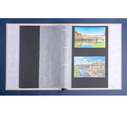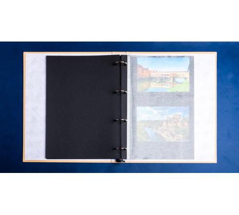 60 black pages with Pergamine. Refillable up to approximately 200 pages. Capacity 120 photos 10x15cm. Plastic free logo paper interior.