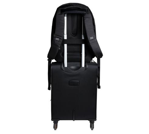 Un passant au dos permet de glisser le sac à dos le long d'une poignée télescopique de valise.