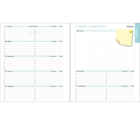 Les + : intérieur coloré, des coloris différents chaque trimestre, pour une année lumineuse et organisée. Agenda imprimé sur papier blanc Clairefontaine, reconnu pour sa qualité et pour permettre une écriture douce et fluide - coins détachables, pour pouvoir accéder rapidement au jour en cours - indication du numéro de semaine pour se repérer plus facilement - chaque jour, mention des Saints pour ne pas oublier les fêtes à souhaiter.