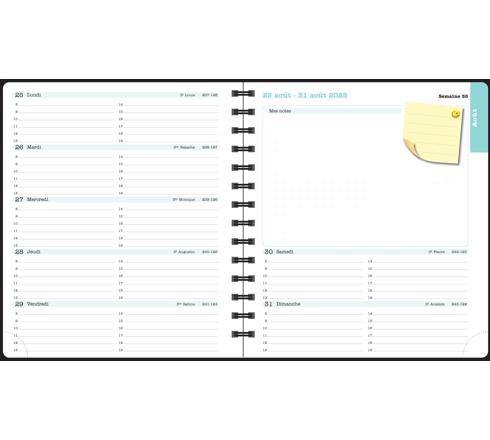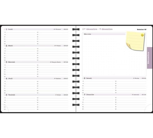 Cet agenda ne pourra que vous séduire : la possibilité de noter des rendez-vous sur les 7 jours de la semaine (rdv par heure, de 8h à 20h) avec une grille du temps à l'horizontale, une grande place pour noter et se rappeler. L'atout supplémentaire : au début de chaque mois, un calendrier mensuel sur 2 pages pour visualiser le mois à venir (sous forme de cases) et s'organiser au mieux. La spirale facilite l'ouverture et la mise à plat de l'agenda. Les + : - impression en couleur sur papier blanc Clairefontaine, reconnu pour sa qualité et pour permettre une écriture douce et fluide, - emplacement mémo, - grande place pour les notes, - coins détachables pour pouvoir accéder rapidement à la semaine en cours, - pochette transparente.