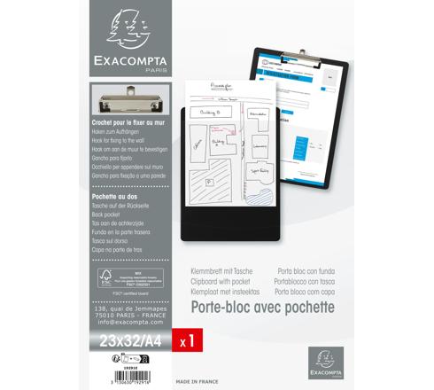 Exacompta Clipboard with pocket, A4 This clipboard with pocket allows taking notes on the front and storing or protecting these finalized notes on the back. The pocket can also be used to personalize the clipboard. The metal clip-on clip has plastic corners so as not to alter documents. The clip is fitted with an eyelet which allows the holder to be hung on a wall hook. 23x32cm format suitable for accommodating A4 documents.