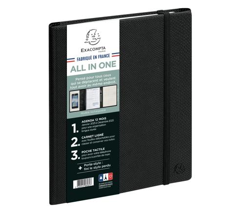 All in one, le triptyque nomade : agenda + carnet + poche pour documents ou télephone. Le compagnon idéal pour les déplacements professionnels, les réunions et les rendez-vous. Le All in one, c'est un agenda, un carnet ligné, avec feuilles détachables pour classer et conserver vos notes, une poche translucide et tactile pour votre téléphone, une poche de rangement pour documents, cartes de visites, tickets de caisse pour les notes de frais, ainsi qu'un porte-stylo (fini le stylo perdu dans le sac !). Le tout, fermé par un élastique, pour emporter vos indispensables en toute sécurité. Une couverture résistante en synthétique aspect textile, que l'on peut recharger avec un nouveau carnet et/ou un nouvel agenda (format A5) l'année suivante.