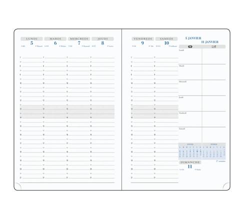 La recharge de votre agenda est fabriquée en France dans nos usines parisiennes. Elle est conçue dans une démarche environnementale d'amélioration continue, par des amoureux du papier depuis plus de 90 ans. Profitez d'une vue hebdomadaire claire grâce à une disposition verticale sur deux pages, offrant un aperçu complet de la semaine en un coup d'œil. Une plage horaire étendue du lundi au samedi (7h à 21h) et un espace de notes pour le dimanche. Des espaces de notes généreux se trouvent également sur le côté. Retrouvez également des mini-calendriers pour le mois en cours et le mois suivant, ainsi que des sections pour noter vos adresses et numéros de téléphone à droite. Édition en français, avec une reliure brochée cousue pour une plus grande solidité.