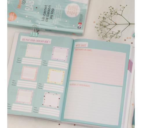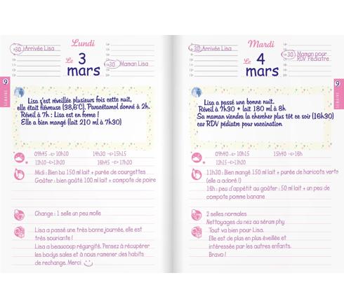 Non daté et une page par jour du lundi au dimanche, à démarrer à tout moment de l'année.Des espaces clairs pour chacun avec deux zones distinctes : une pour les parents, une pour le professionnel. Des rubriques précises pour noter repas, siestes, changes, soins et "ma journée en bref”.