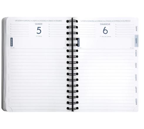 Un agenda sobre et pratique au look vintage. Avec un large espace ligné chaque jour, cet agenda A5 grand format est recommandé pour les écoliers, les enseignants, et est idéal pour réaliser son journal de bord ou son journal intime (pour noter ses to-do lists, consigner des moments clés de sa journée et ses souvenirs). Une page par jour, y compris le week-end. Couverture spiralée cartonnée à l'aspect grain cuir, élastique de fermeture. Ouverture pratique à plat et à 360 degrés