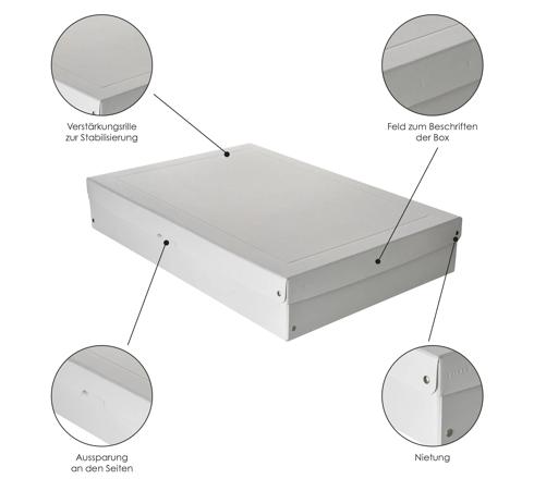 Heavy-duty lever binder, equipped with high-quality mechanics, a spine label to identify the contents, metal corners and reinforcements, a gripping eyelet and rados.