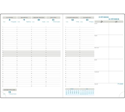 Les + : impression en bleu et gris, sur papier blanc Clairefontaine, reconnu pour sa qualité et pour permettre une écriture douce et fluide, tranche naturelle, emplacements rappels ou mémos, coins détachables, pour pouvoir accéder rapidement à la semaine en cours.