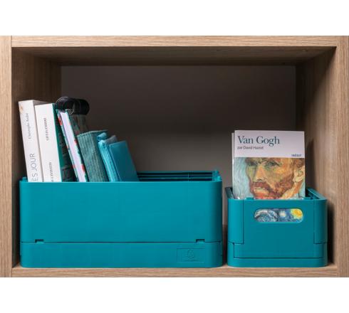 Respectueuse de l'environnement, cette boîte pliable est fabriquée en plastique recyclé issu des déchets ménagers et est ainsi certifiée GRS.