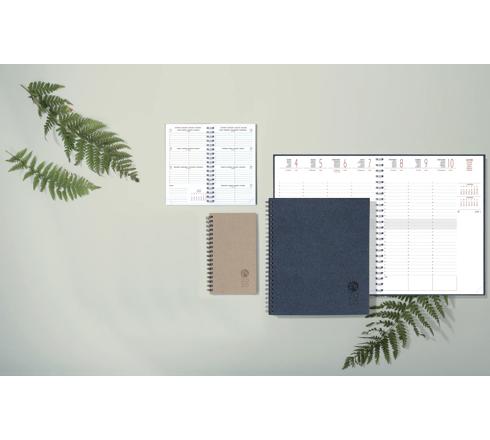 Couverture rigide en carton recyclé recouvert de papier à motifs embossés. Intérieur imprimé sur papier 100% recyclé certifié Ange Bleu. Spirale en métal. Impression en bordeaux et gris, sur papier blanc, tranche naturelle, coins détachables, pour pouvoir accéder rapidement à la semaine en cours, emplacements pour les rappels.